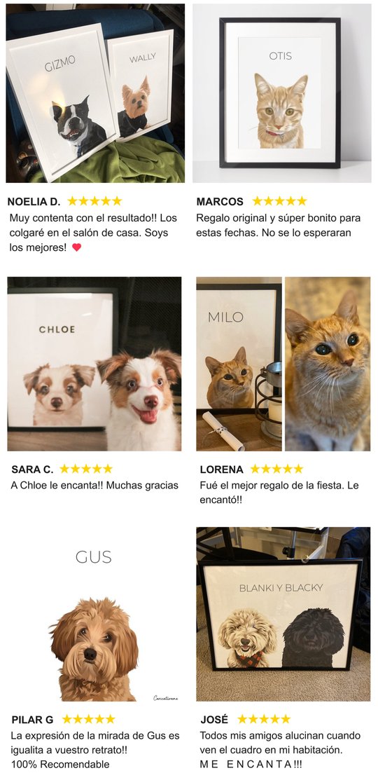 Ahora estás a dos sencillos pasos de conseguir tu retrato: elige tu formato preferido y dinos el nombre de tu perro o gato.